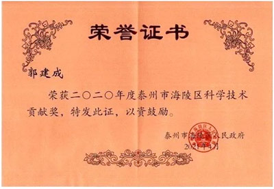 春蘭清潔能源公司郭建成同志榮獲2020年度海陵區(qū)科學(xué)技術(shù)貢獻(xiàn)獎(jiǎng)