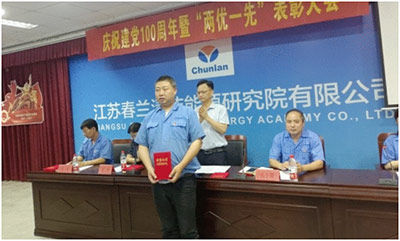 江蘇春蘭清潔能源研究院有限公司舉行慶祝中國共產(chǎn)黨成立100周年暨“兩優(yōu)一先”表彰大會(huì),對先進(jìn)支部和優(yōu)秀個(gè)人進(jìn)行表彰,進(jìn)一步弘揚(yáng)愛崗敬業(yè)、拼搏進(jìn)取、奮勇爭先的精神,以榜樣的力量凝聚強(qiáng)大發(fā)展合力,以實(shí)際行動(dòng)向中國共產(chǎn)黨成立100周年獻(xiàn)禮。