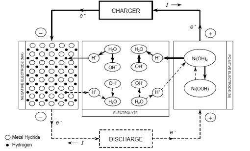 鎳氫電池以金屬氫化物為負(fù)極活性材料,以Ni(OH)2為正極活性材料,以氫氧化鉀水溶液為電解液。