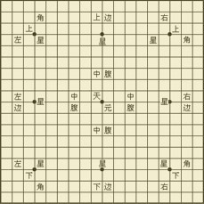 字只是在棋譜中為便于說明著子點(diǎn)或?yàn)榉奖阋撞槎鴺?biāo)明的。 棋盤上可分為九個(gè)部分,分別稱為:左上角、左下角、右上角、右下角、上邊、下邊、左邊、右邊和中腹(見圖)。