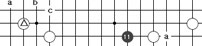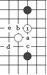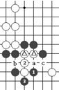 是常見的“飛”棋形,左邊叫“小飛”,右邊叫“大飛”。凡在△周圍a、b、c等處著子,構(gòu)成中國象棋的“馬步”(即從原有棋子向“日”字形的對角上下一子)的都叫“飛”,或“小飛”。比小飛多一路下子,即走到“目”字形的對角上,叫“大飛”如在a位再放一子就成了“雙飛”。