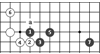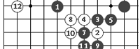 黑1對白☆子而言叫做夾擊。而白2對☆叫跳,黑3靠,白4對黑3叫扳,黑5退,白6跳,黑7斷,白8長,黑9打,白10拐,黑11粘,白12夾。