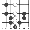 把兩個不相連的棋子連接起來,叫“接”。如圖的黑1就把兩個黑子連接起來了。   黑1入白眼內(nèi)行棋叫“點”。凡對方棋還存有缺陷,還沒活凈時,“點”常常能致敵于死地。