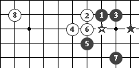 黑1對☆子而言叫托,白2扳,黑3退,白4虎,黑5點,白6粘,黑7對黑★叫飛,白8拆。